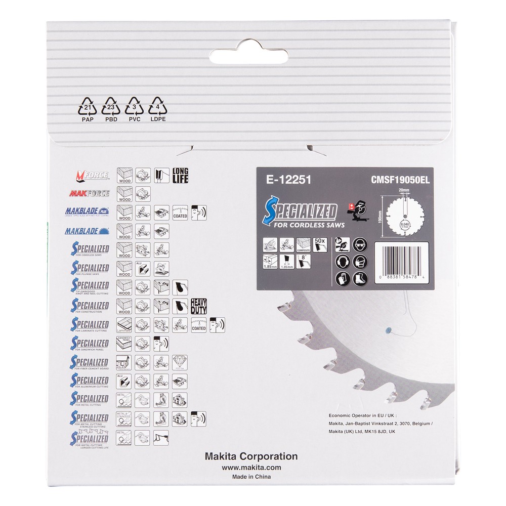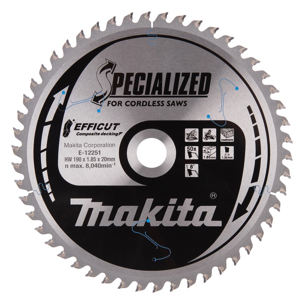 Disco EFFICUT de Makita diseñado para cortes rápidos y limpios en madera y materiales composite, ideal para sierras ingletadoras y trabajos exigentes.