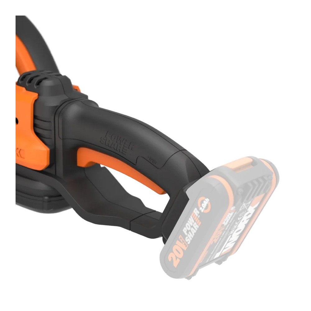 Worx WG261E.9 — cortasetos inalámbrico PowerShare 20V Máx (herramienta sola, sin batería ni cargador). Ligero, equilibrado y con cuchillas de doble acción para un corte cómodo y con menos vibración.