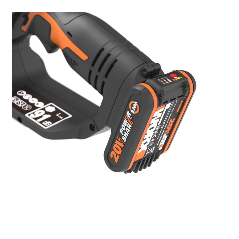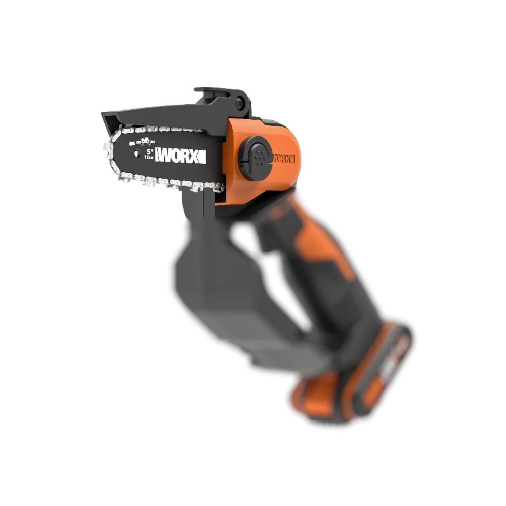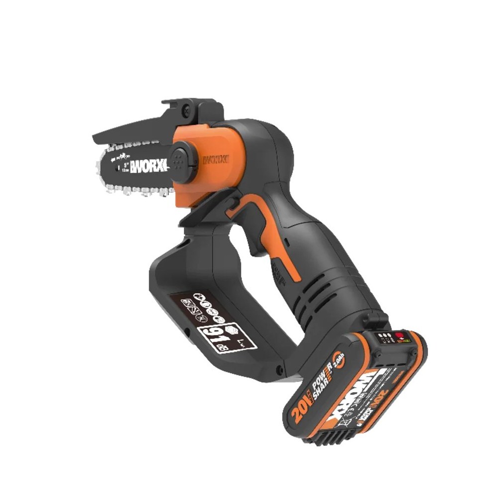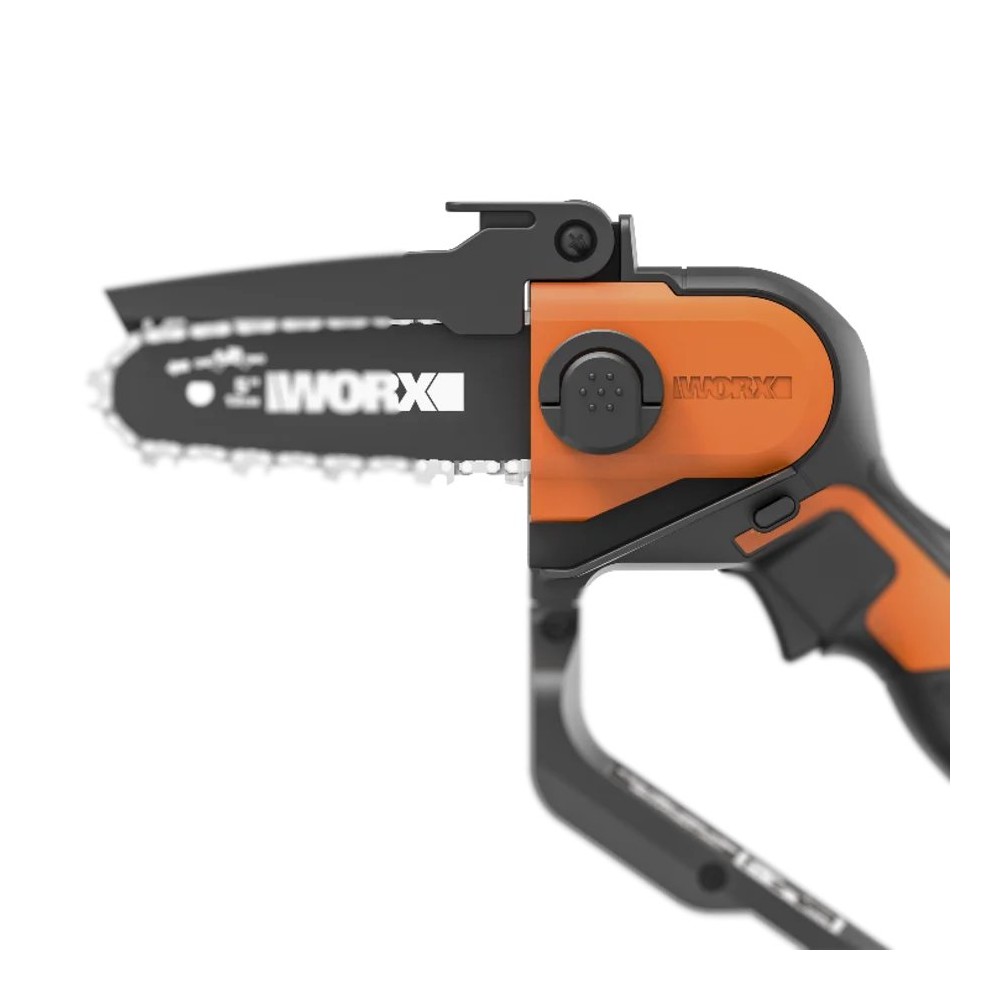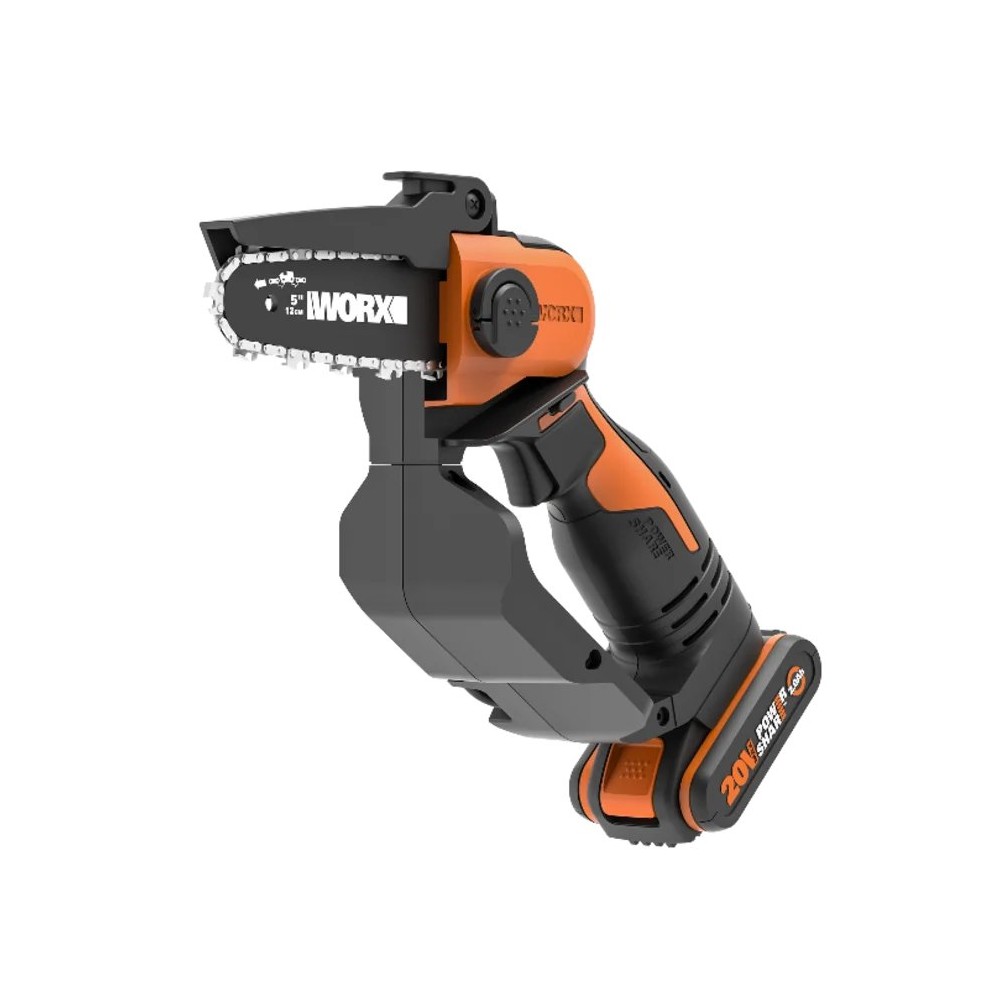 La Worx WG324E es una mini motosierra de poda 20V PowerShare muy ligera para podar, desramar y trocear con una sola mano, con capacidad de corte de hasta 12 cm y doble protección (guardamanos + protector superior de cadena).
