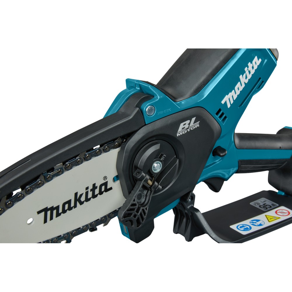 Sierra de poda compacta para el cuidado del jardín. Nuevo cambio sin herramientas y ajuste de la tensión de la cadena que permite tensar y aflojar la cadena fácilmente. La protección móvil cubre la parte superior de la barra guía y se abre gradualmente si la cadena de la sierra corta ramas gruesas. Sin batería, sin cargador en equipo básico.