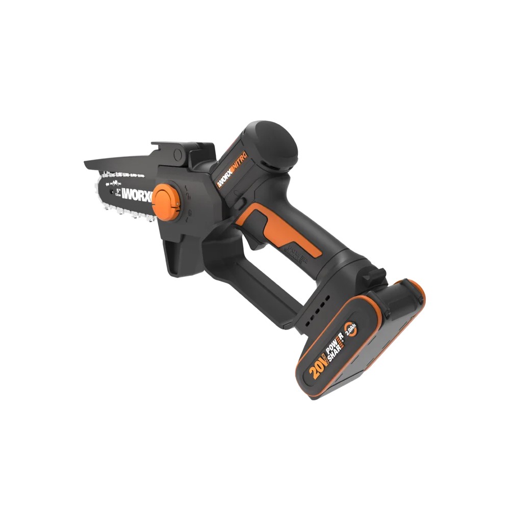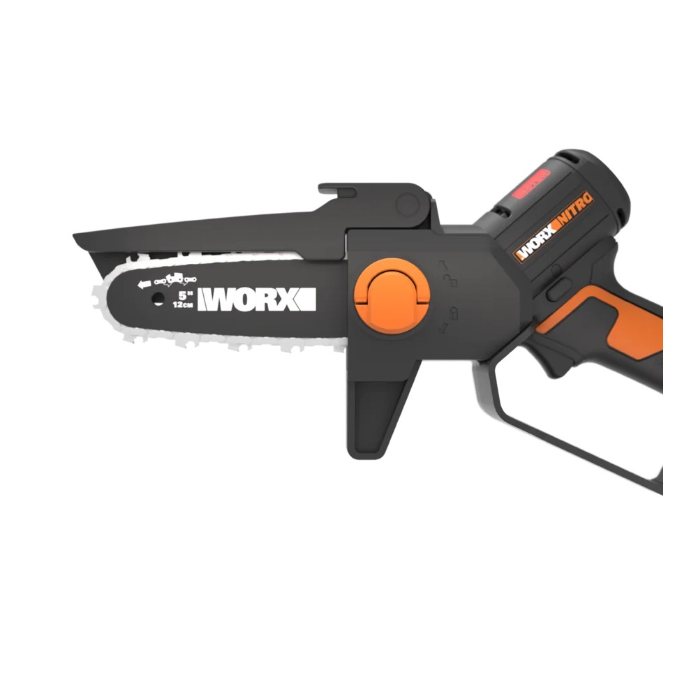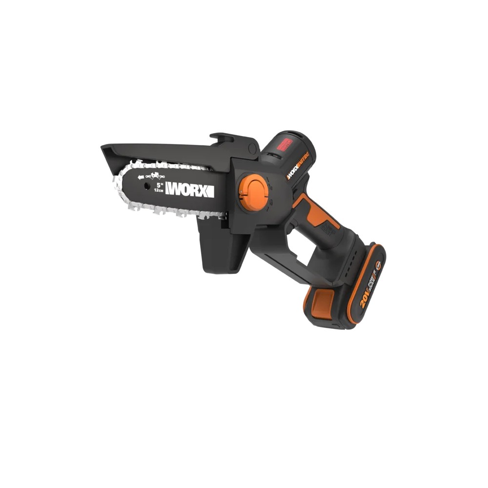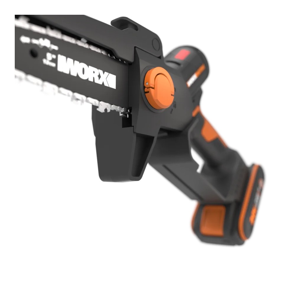 Worx WG325E.9 – Mini motosierra a batería 20V con motor sin escobillas, espada de 12 cm y lubricación automática de la cadena. Ligera y manejable con una sola mano, ofrece hasta 16 cortes por carga. Solo herramienta, sin batería ni cargador. Compatible con la plataforma PowerShare 20V/40V/80V.