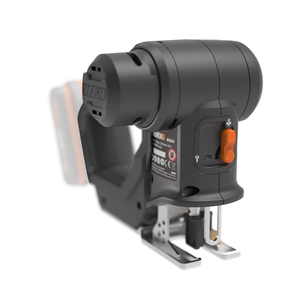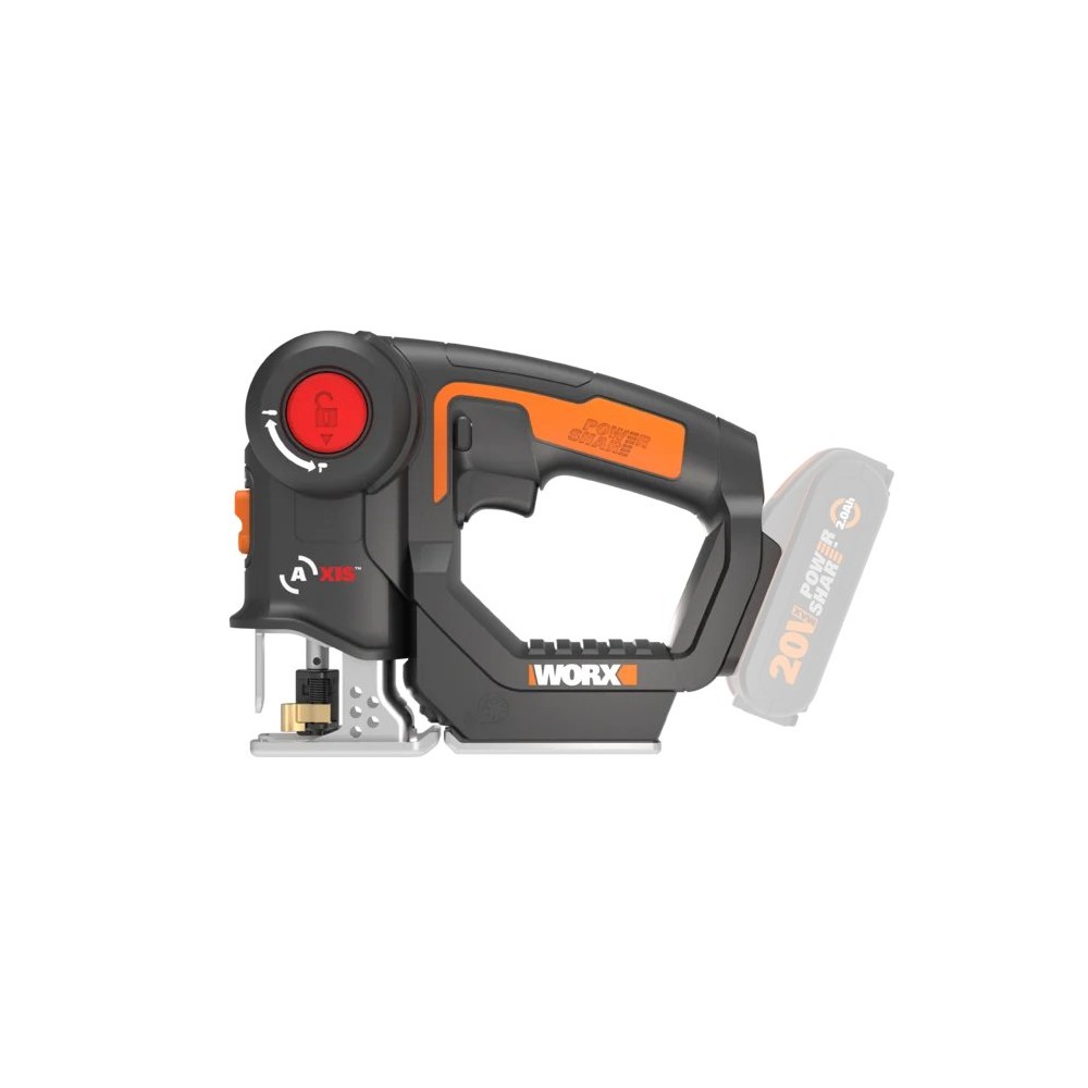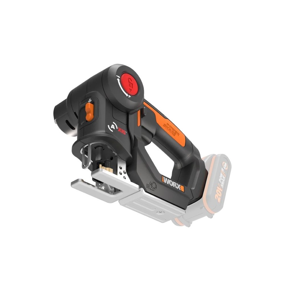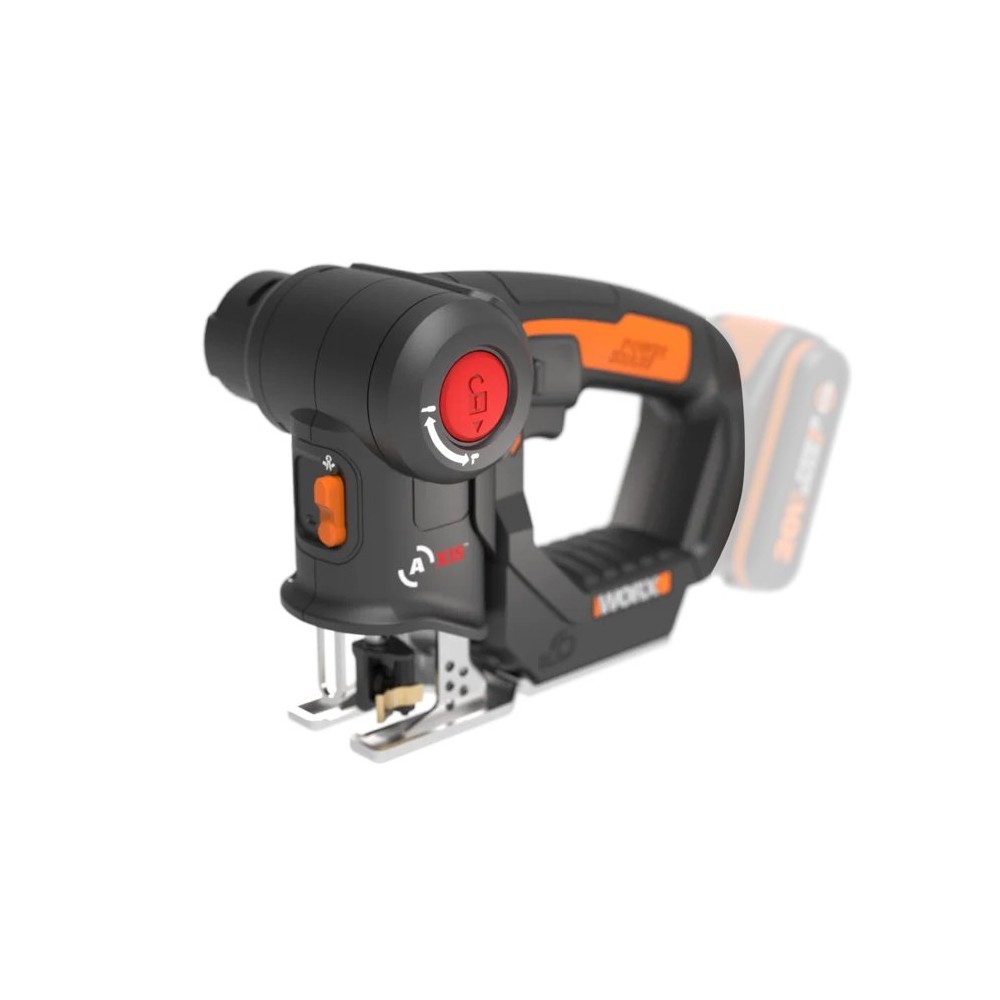 La Worx Axis WX550.9 es una sierra 2 en 1 que se transforma de sierra sable a sierra de calar con solo pulsar un botón. Incluye velocidad variable, función pendular, luz LED y soplador para mejorar la visibilidad de corte. No incluye batería ni cargador.