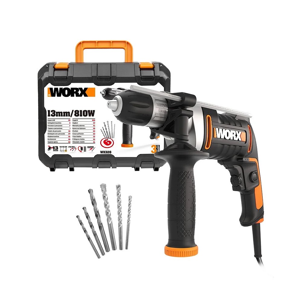 Worx WX328 – Taladro percutor con cable 800W, equilibrado y ligero para mayor comodidad y rendimiento. Equipado con portabrocas sin llave de 13 mm, control de velocidad variable, empuñadura adicional y tope de profundidad. Incluye 3 brocas HSS, 3 brocas para hormigón y tope de profundidad. Garantía de 5 años (2 años estándar + 3 con registro).