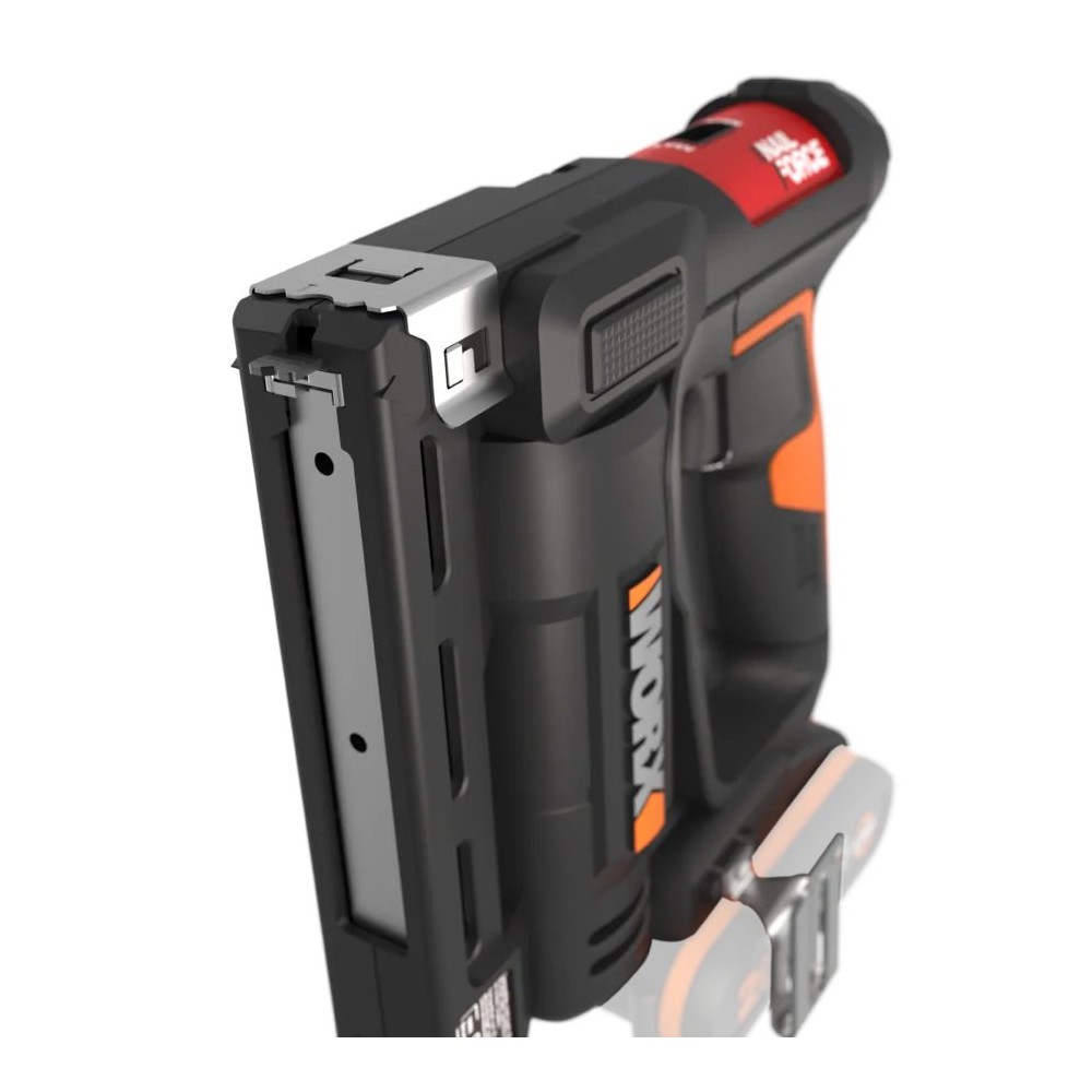 La Worx WX843.9 est une mini agrafeuse cloueuse sans-fil, parfaite pour les travaux de bricolage et les projets domestiques. Son design polyvalent permet de combiner les fonctions d'agrafeuse et de cloueuse, facilitant le travail sur différentes surfaces.