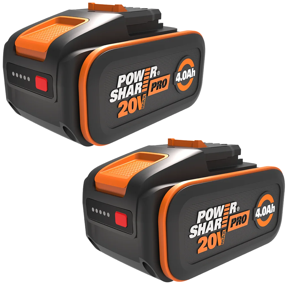 Le pack WORX WA3644.2 comprend 2 batteries 20V 4,0 Ah PowerShare Pro avec indicateur de charge pour plus d'autonomie et de performance.
