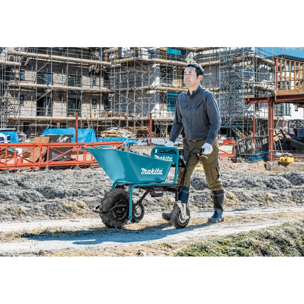 Le chariot à batterie 18V LXT® est un excellent outil pour les chantiers, les fermes et les maisons de vacances. Il parcourt 3,5 km avec une seule batterie de 6,0 Ah, jusqu'à 7 km avec deux. Capacité maximale de 130 kg, deux vitesses, marche arrière et frein. Batterie et chargeur non inclus. Plaque métallique et lit plat en accessoires.