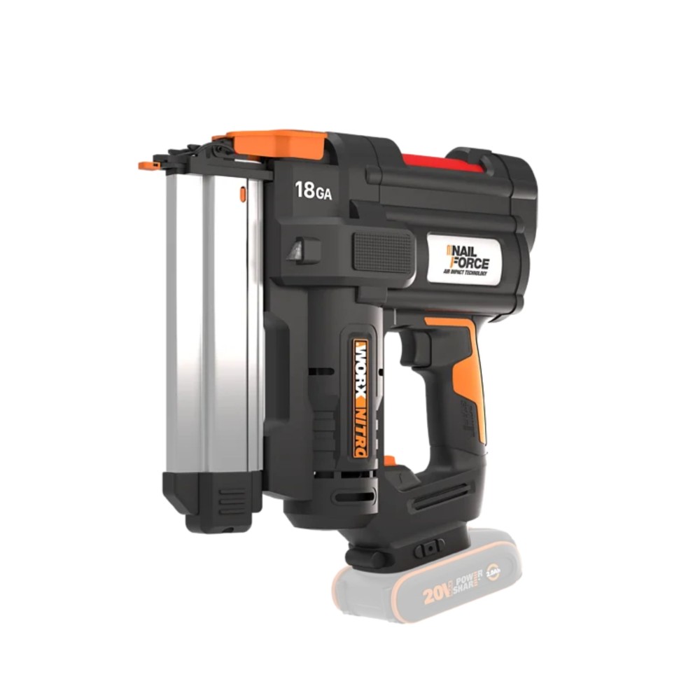 Worx WX842.9 – Cloueur sans-fil 20V PowerShare 18GA équipé de la technologie NailForce à impact d'air. Permet de tirer jusqu'à 80 clous par minute et de clouer des clous de 1,2 mm de diamètre et jusqu'à 50 mm de long dans du bois dur. Outil seul, sans batterie ni chargeur.