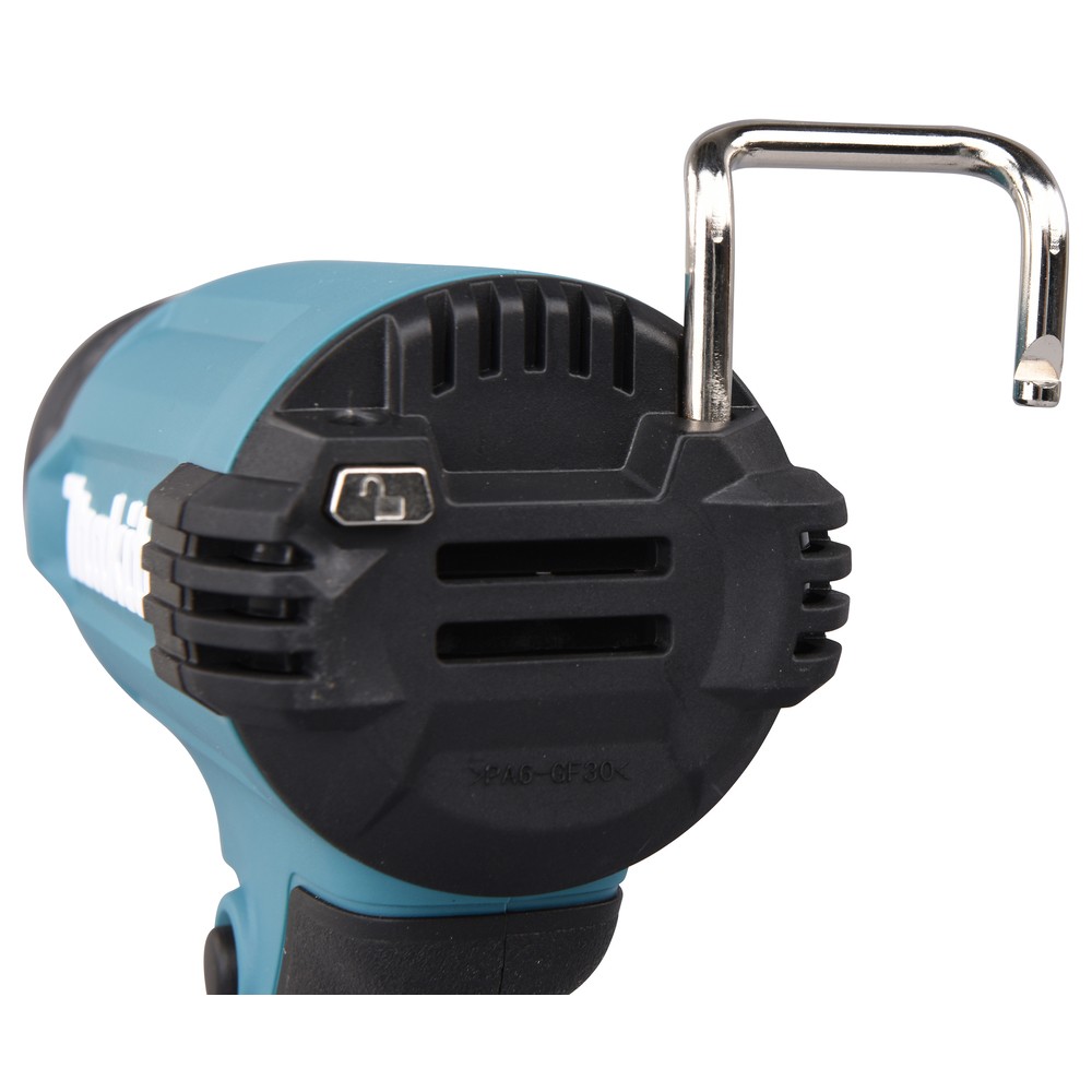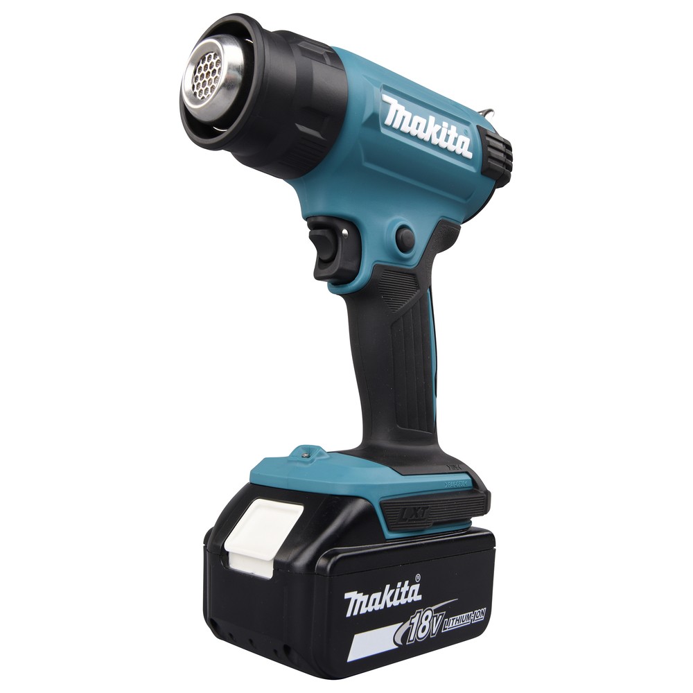 La DHG180 de Makita a une autonomie continue avec la batterie de 6,0 Ah allant jusqu'à 20 minutes. Structure légère et compacte et poignée en caoutchouc souple pour un meilleur confort au travail. Interrupteur de gâchette confortable avec fonctions de verrouillage marche/arrêt. De plus, buses facilement démontables et lumière LED pour éclairer la zone de travail.