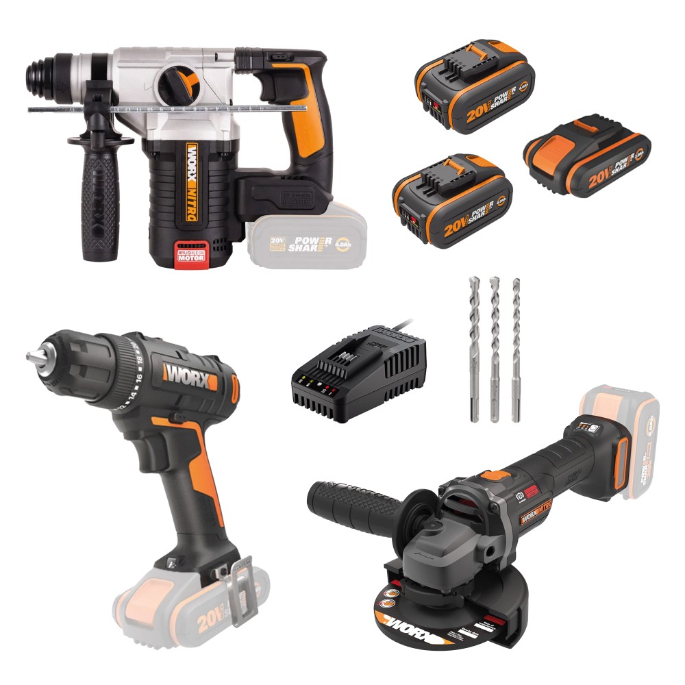Pack Worx Marteau SDS-PLUS+ Meuleuse 20V + Perceuse Visseuse