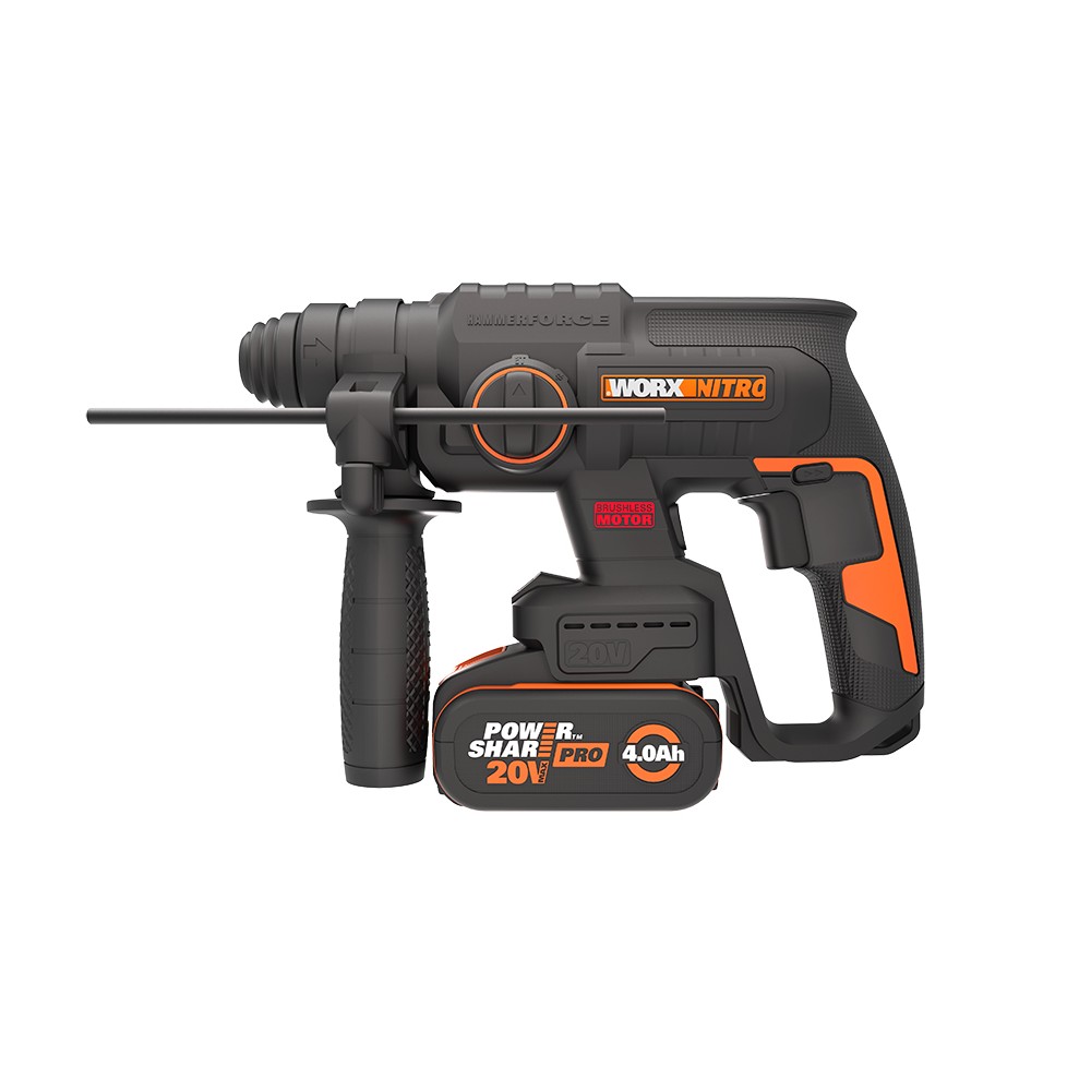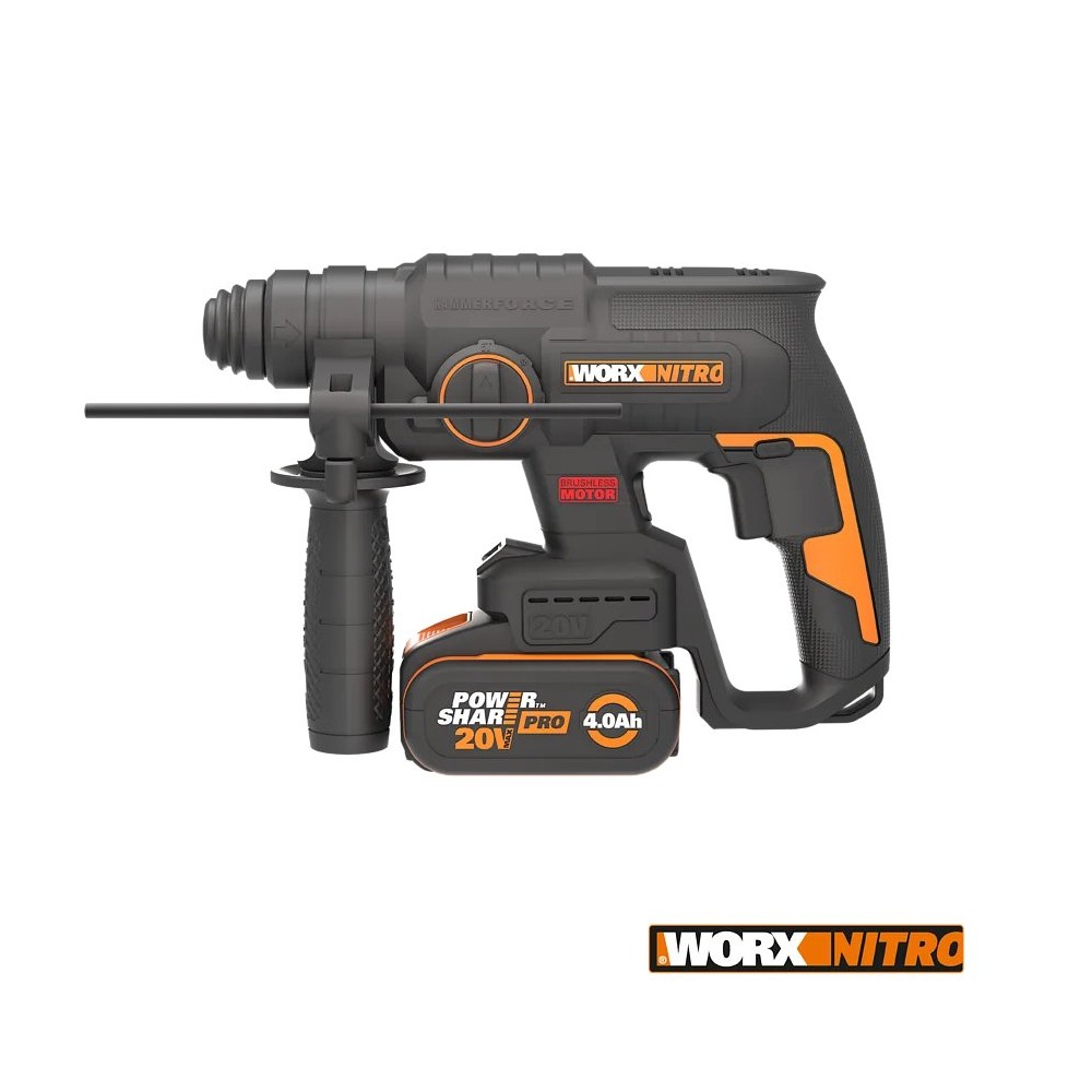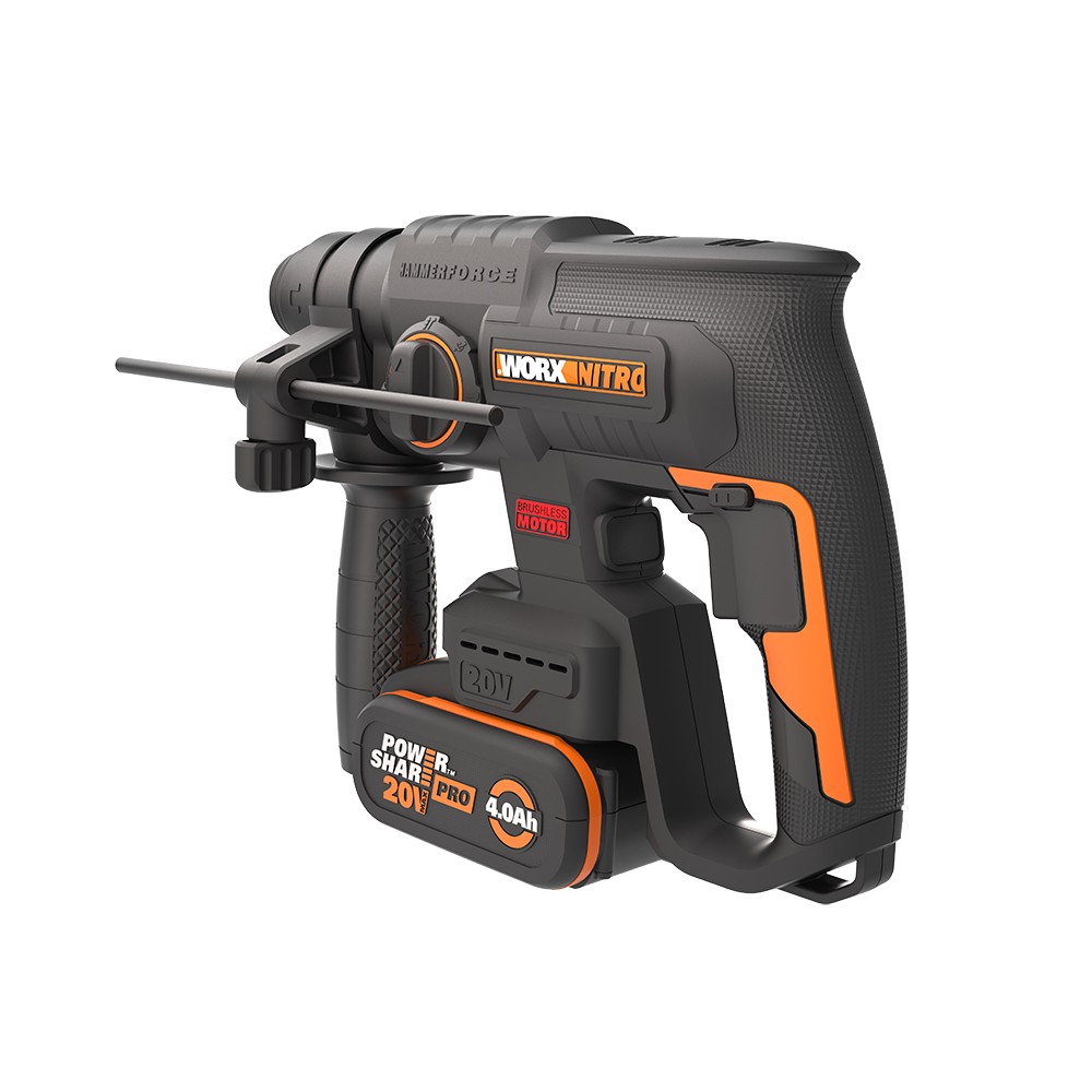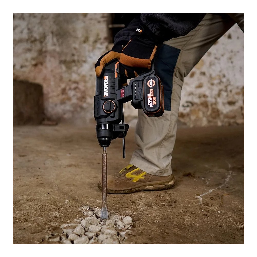 Worx WX381 — marteau perforateur burineur SDS-Plus 20V Max (PowerShare) avec moteur sans balais et 2,0 J d’énergie de frappe. Compact et léger pour percer et buriner avec maîtrise.