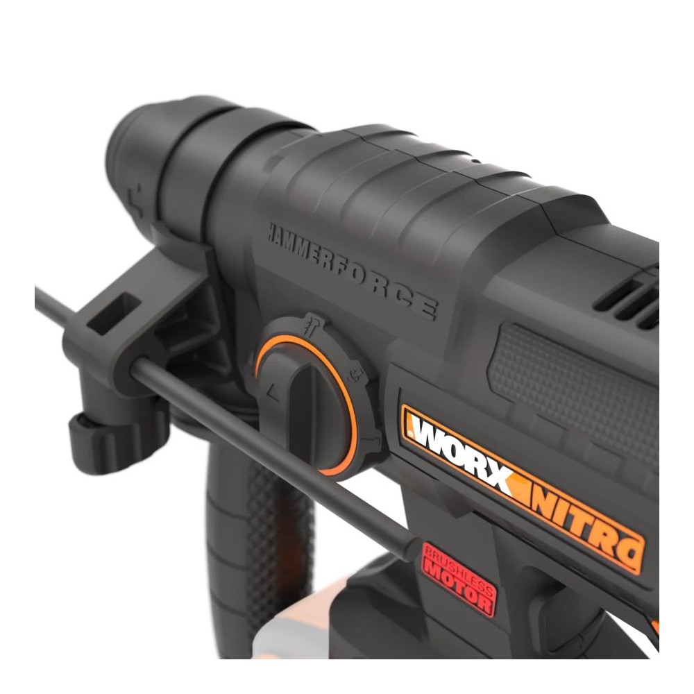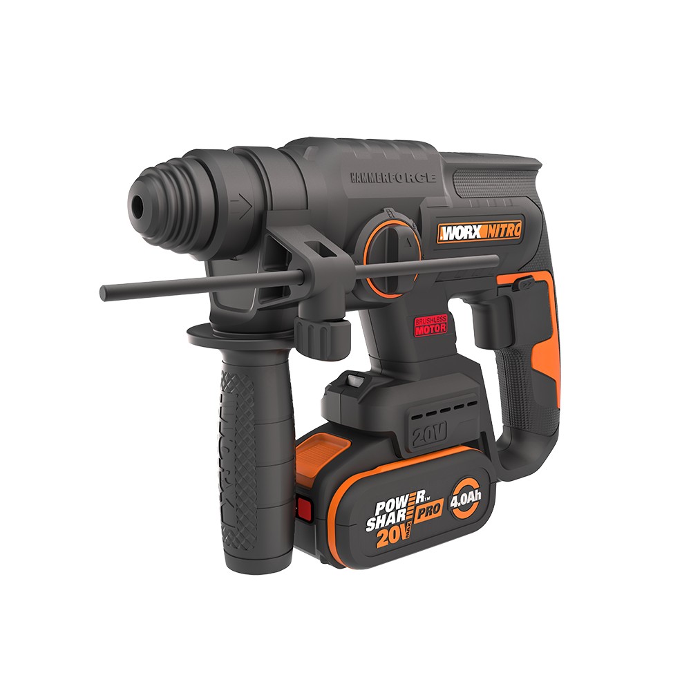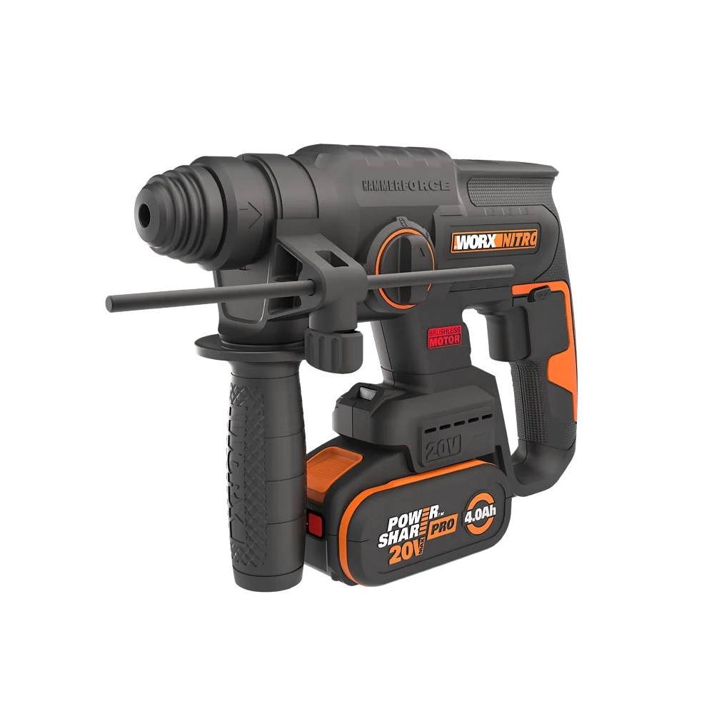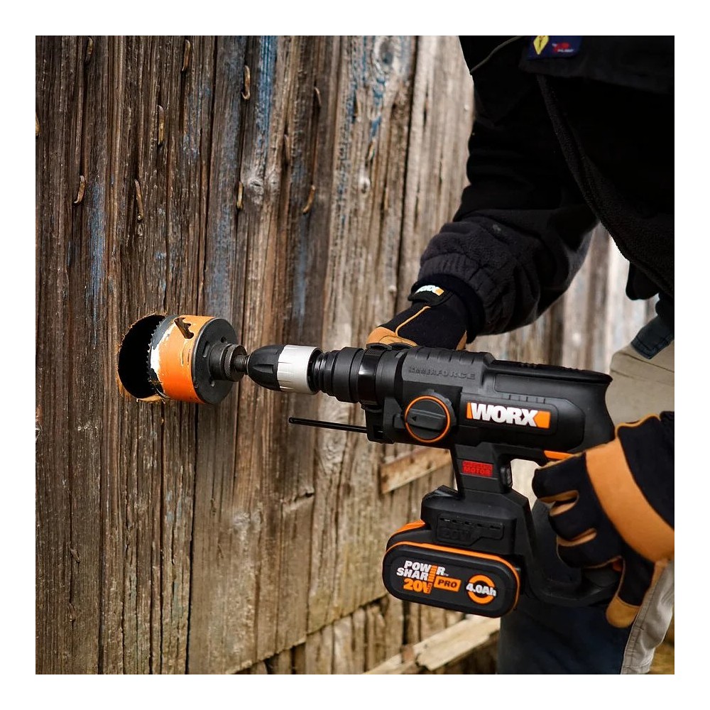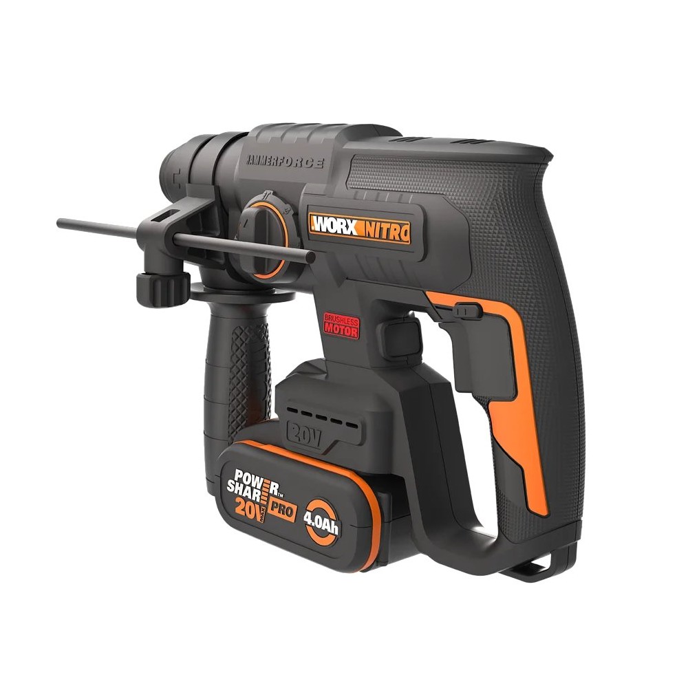Worx WX381 — marteau perforateur burineur SDS-Plus 20V Max (PowerShare) avec moteur sans balais et 2,0 J d’énergie de frappe. Compact et léger pour percer et buriner avec maîtrise.