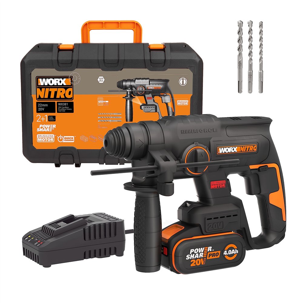 Marteau perforateur burineur SDS-Plus sans fil WORX WX381 - 2 J - Brushless - 20V - Inclut 1 batterie 4Ah, chargeur et coffret