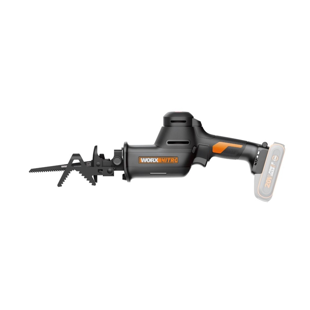 Worx WG893E.9 – Scie sabre compacte 20 V PowerShare, moteur sans balais, course de lame de 26 mm avec vitesse variable jusqu'à 3.000 tr/min. Capacité de coupe du bois jusqu'à 80 mm et poids léger (1,8 kg, outil seul). Ne comprend pas de batterie ni de chargeur.