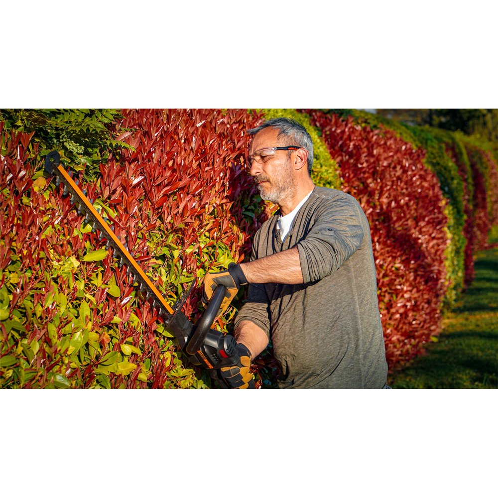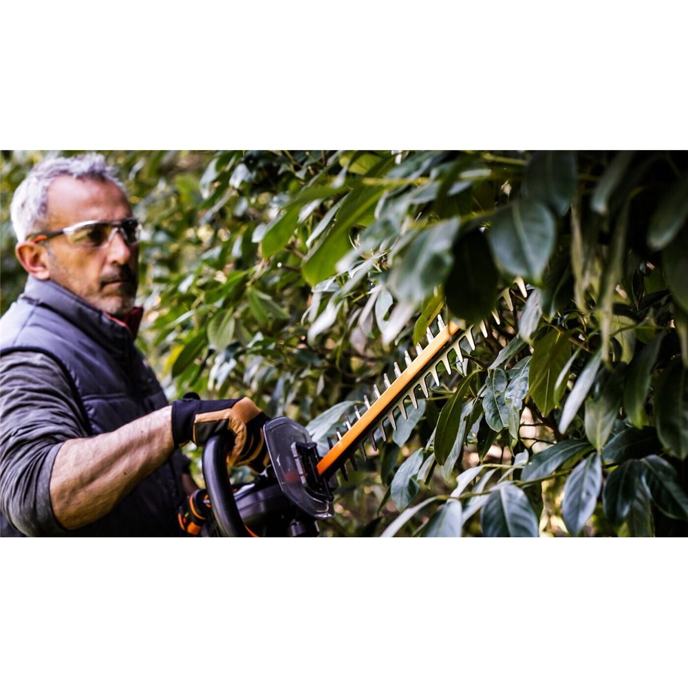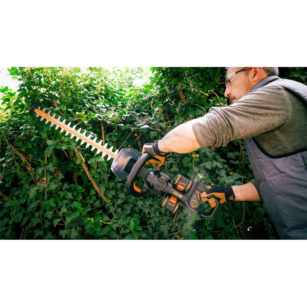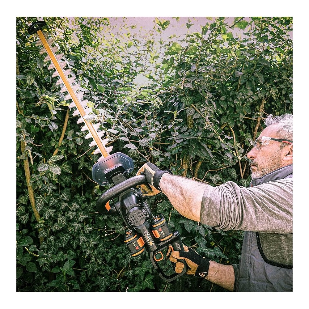 POTENT ET LÉGER: Le Worx WG286E.9 est un taille-haies 40V (2x20V) qui égalise les performances à essence grâce à son moteur sans balais. Avec une lame de 61 cm et 3400 coupes/min, il taille les haies denses avec précision et moins de vibrations.
