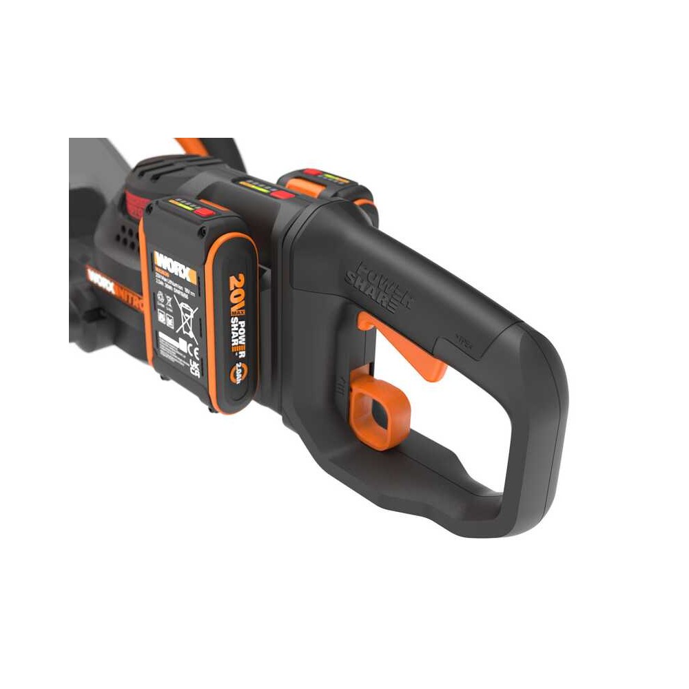 Le taille-haies Worx WG286E.9 de 40V (2x20V) offre des performances de type essence avec un moteur sans balais et une lame de 61 cm. Il coupe des branches jusqu'à 27 mm avec 3400 coupes/min, moins de vibrations et un contrôle maximal.