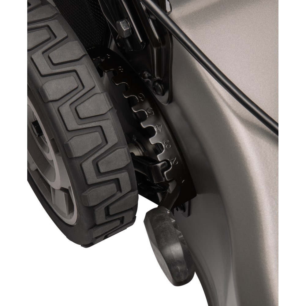 La hauteur de coupe de la tondeuse peut être ajustée entre 20 et 100 mm et sa largeur de coupe est de 530 mm. La vitesse de propulsion de la tondeuse est de 2,5 - 5 km/h et elle dispose également d'une fonction de démarrage en douceur. Ses grandes roues garantissent une coupe en douceur même lorsqu'elle est poussée manuellement.