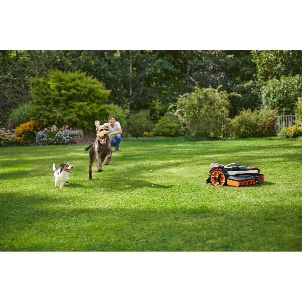 AUTONOMIE INTELLIGENTE: Auto-schedule adapte le travail au climat, à l'espèce de gazon et au sol ; multizone, IPX5 pour lavage au tuyau, OTA pour mises à jour et batterie PowerShare compatible avec les outils WORX.