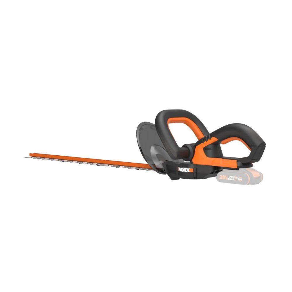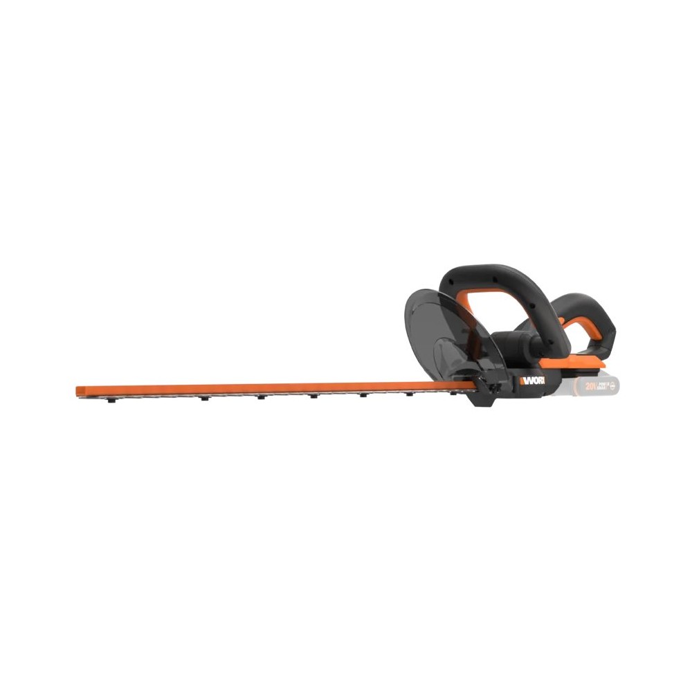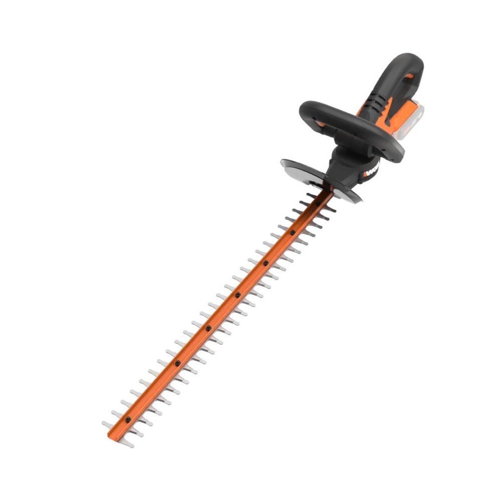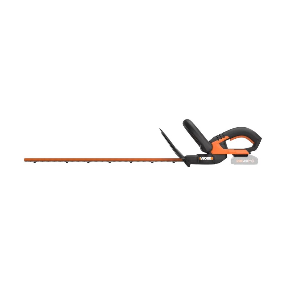 Coupe-haies à batterie 20V de Worx. Il dispose d'une longueur de coupe de 61 cm, coupe des branches jusqu'à 20 mm de diamètre. Son système de commutation à deux mains évite le démarrage accidentel de l'outil. Il est équipé de lames à double action coupées au laser garantissant une meilleure efficacité de coupe et une vibration réduite. Il intègre une poignée avant avec multiples prises pour différentes positions de coupe et un protecteur de main. Il appartient à la plateforme Powershare de batteries interchangeables entre tous les outils de 20V de Worx.