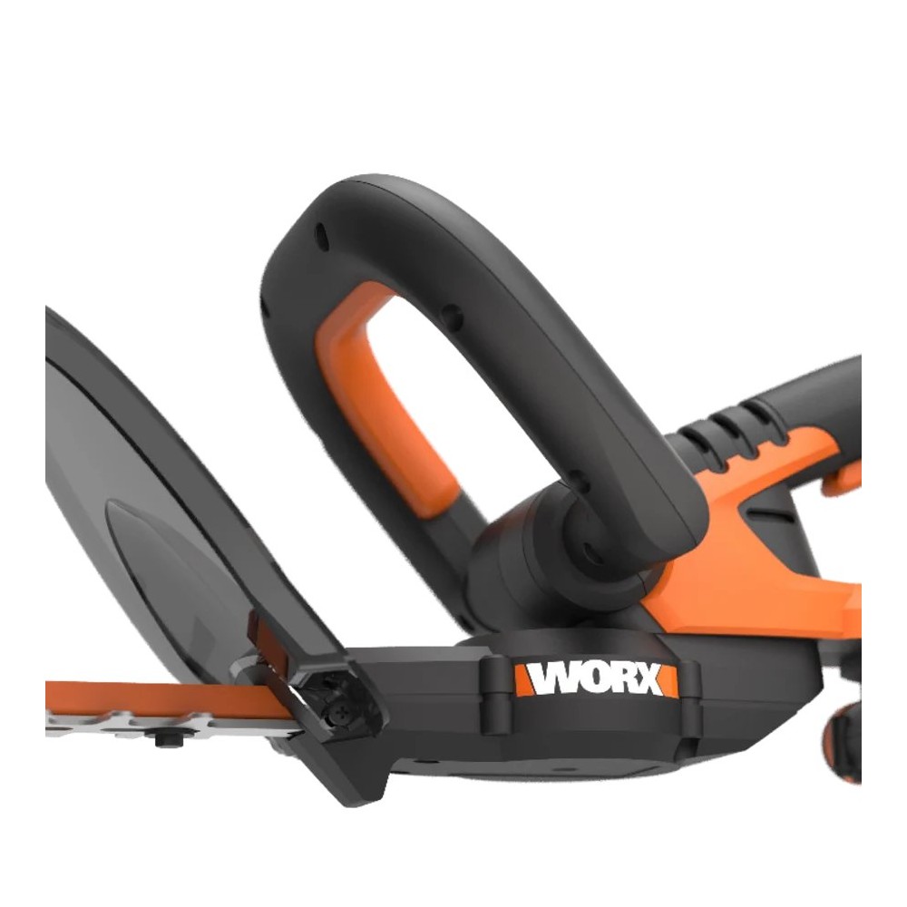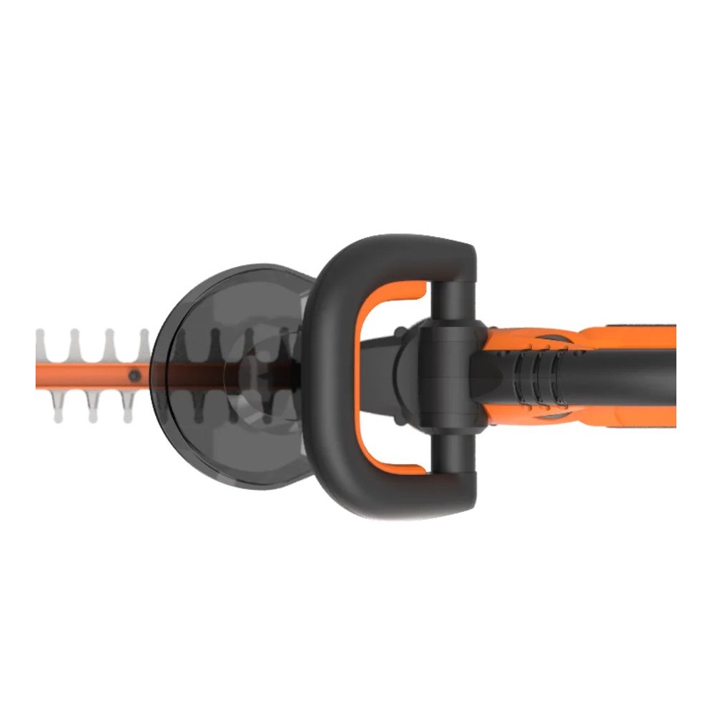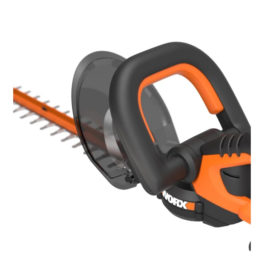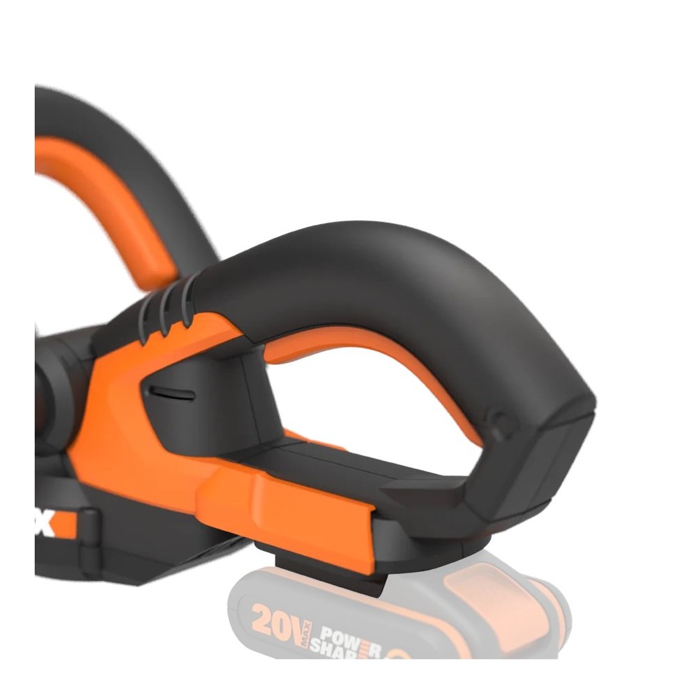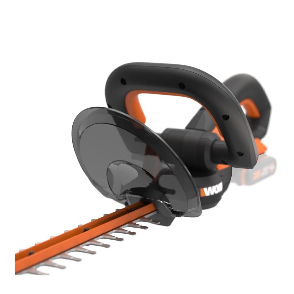 Coupe-haies à batterie 20V de Worx. Il dispose d'une longueur de coupe de 61 cm, coupe des branches jusqu'à 20 mm de diamètre. Son système de commutation à deux mains évite le démarrage accidentel de l'outil. Il est équipé de lames à double action coupées au laser garantissant une meilleure efficacité de coupe et une vibration réduite. Il intègre une poignée avant avec multiples prises pour différentes positions de coupe et un protecteur de main. Il appartient à la plateforme Powershare de batteries interchangeables entre tous les outils de 20V de Worx.